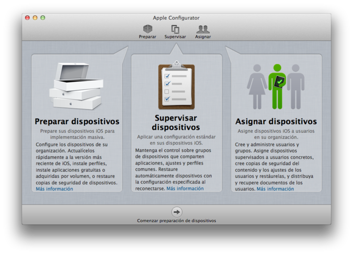 Apple Configurator es la solución de Apple para gestionar varios dispositivos Apple -iPod touch, iPad e iPhone- directamente desde un Mac a través de USB.