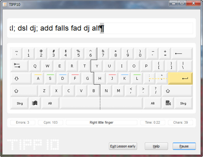 La pantalla de TIPP10 te muestra todo el teclado, marcado con códigos de colores, uno para cada dedo. En la parte superior irán apareciendo los caracteres que debes pulsar.