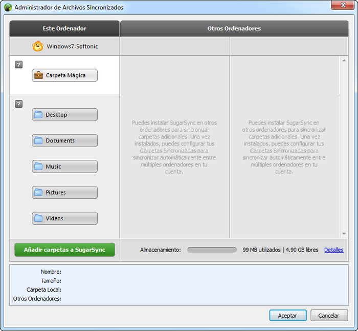 Por otro lado, SugarSync permite elegir qué carpetas del disco duro se sincronizarán, y diferencia los equipos o teléfonos sincronizados mediante iconos fácilmente identificables.