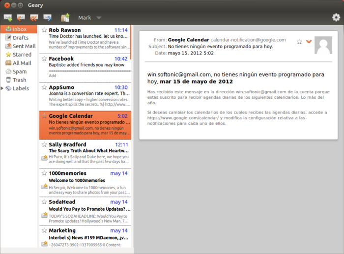 Geary es un cliente de correo electrónico que destaca por su sencillez y por el diseño de su interfaz, mostrando los mensajes de una forma más cómoda.