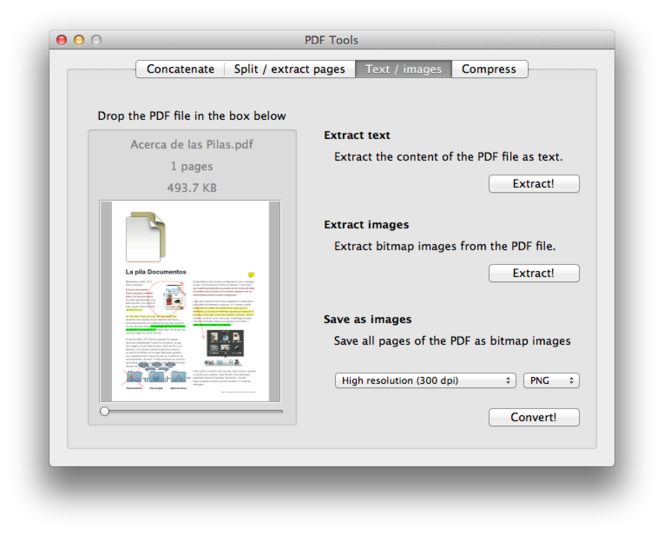 PDF Toolkit puede extraer el texto y las imágenes de los documentos PDF. También tienes la opción de guardar todas las páginas del PDF en formato imagen, tanto en formato PNG como JPEG o TIFF, con la posibilidad de elegir la resolución.
