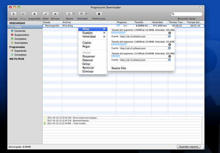 Progressive Downloader es un serio competidor para aplicaciones como Folx, Speed Download o jDownloader, ya que reúne las mismas funciones y consigue la misma o más velocidad en la descarga.