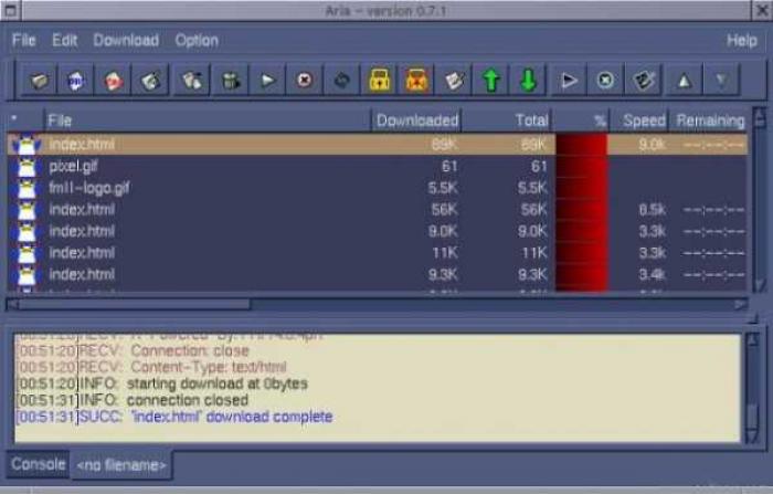 Con Aria tendremos opción de resumen, posibilidad de realizar las descargas a través de FTP o HTTP, pausar o preparar, etc. Otras características interesantes de Aria son, por ejemplo, que soporta CRC Check, servidores Proxy, cortar y pegar, y las siempre molestas páginas de descarga CGI.