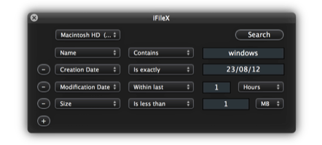 iFileX añade todo tipos de opciones para filtrar las búsquedas. La solución esta optimizada para buscar en los discos en formato HFS (Mac Journaled), no requiere indexación, puede buscar archivos ocultos (hidden) y es 100% compatible con Lion. Usted puede especificar más de una condición a la vez a la hora de hacer una búsqueda, con opciones tales como:
