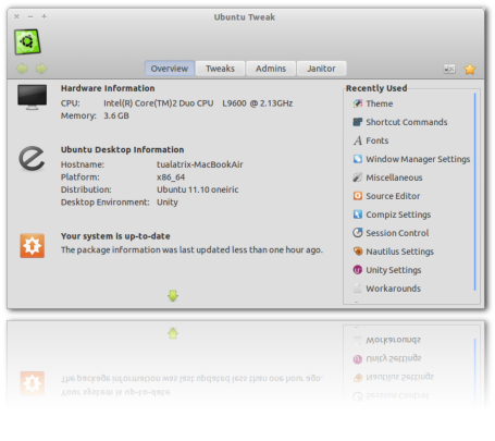 Ubuntu Tweak ofrece información sobre el sistema, control de la sesión en Gnome, aparición o no de iconos y elementos y configuración de Unity