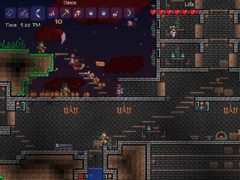 El mundo de Terraria rebosa de vida y eventos interesantes. Cuando sale la luna roja, por ejemplo, más vale que te refugies en tu castillo, pues los zombis saldrán en masa a buscarte. Y si te internas en las profundidades de la tierra, puede que encuentres a uno de los jefes finales.