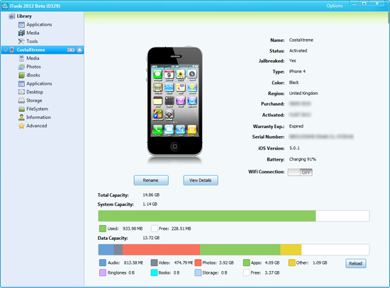 Para empezar, iTools for Mac ofrece información completa de tu dispositivo iOS, como modelo, cuándo y dónde lo compraste, cuándo acaba la grantía, el porcentaje de batería, el número de serie y la versión del sistema operativo, así como la cantidad de espacio del disco ocupado en música, vídeo, libros y otros contenidos.