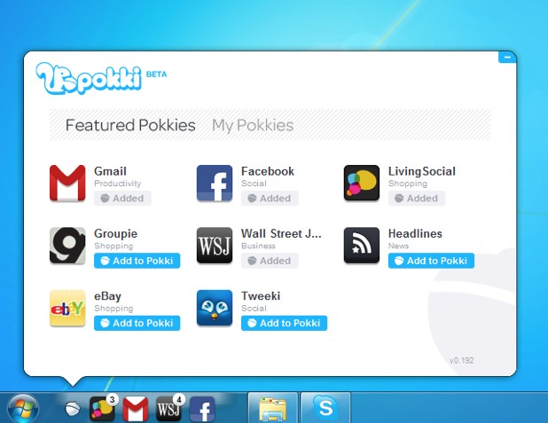 Pokki añade tus aplicaciones web favoritas, como Facebook o GMail, a la barra de tareas de Windows 7. Se cargan como iconos y muestran prácticas notificaciones y números de ítems pendientes. Un clic y Pokki las abre en elegantes recuadros.