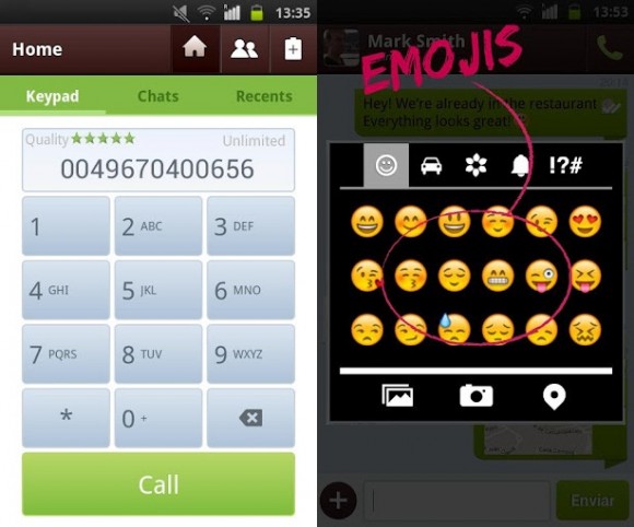 yuilop tiene un aspecto muy agradable y es muy fácil de usar. Los contactos se dividen en pestañas según su tipo (agenda, Facebook Messenger, etcétera) y enviar SMS o chatear solo requiere un par de toques.