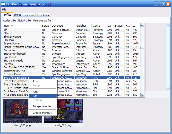 Para cada juego, DBGL permite crear un perfil DOSBox diferente, así como rellenar la ficha pertinente con datos y capturas obtenidos de Internet.