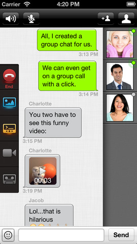 Las llamadas, pueden hacerse tanto a un contacto como en grupos. Los mensajes de texto, por su lado, incluyen las funciones habituales en aplicaciones de su categoría: envío de imágenes, vídeos, grabaciones de voz o tu posición en el mapa.