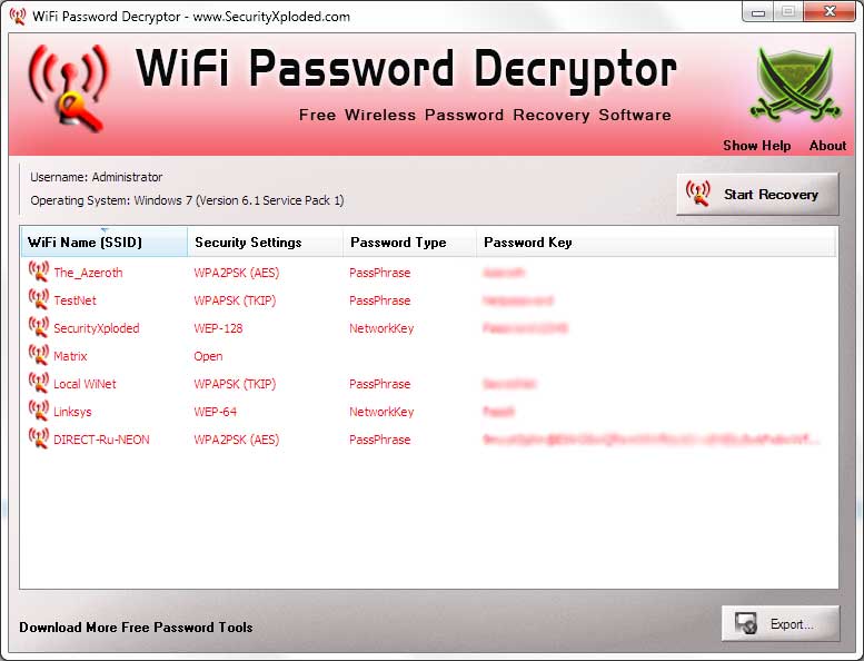 Usar el programa es sencillo: basta con hacer clic en Iniciar Recuperación y en un momento WiFi Password Decryptor mostrará el SSID de las redes reconocidas y la contraseña, claramente o en formato HEX.