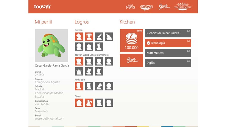 Para usar Toovari para Windows 8.1 tendrás que crearte una cuenta, tanto si eres alumno como profesor. En el primer caso, será necesario también incluir los datos de contacto de un progenitor. Una vez creada la cuenta, el contenido mostrado en pantalla se adaptará al curso y edad del usuario registrado.