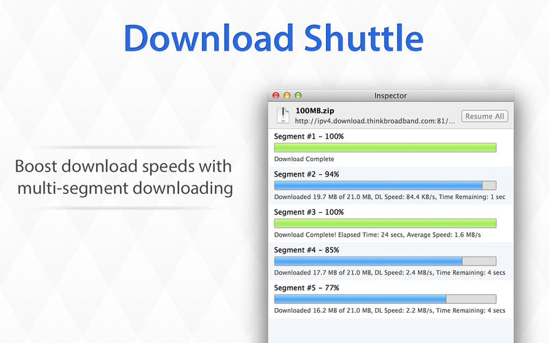 A diferencia de los gestores al uso, Download Shuttle descarga un archivo por segmentos, bajando un mínimo de cinco segmentos por archivo a la vez. Esto acelera la descarga.