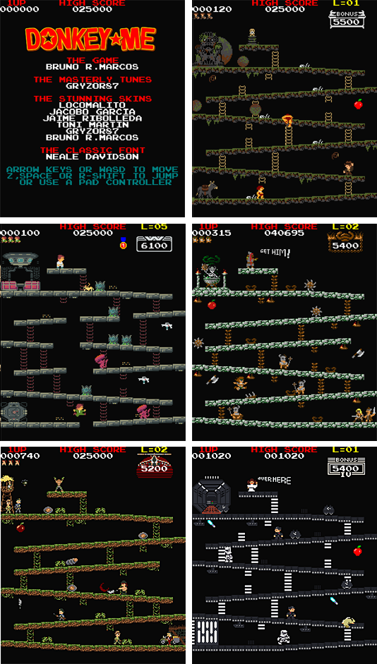 Donkey-Me es un homenaje fantástico a Donkey Kong, uno de los juegos clásicos de referencia absoluta en el género de plataformas. Sin embargo, en vez de copiar píxel a píxel al clásico y quedarse ahí, el autor decidió aderezarlo con unos “skins” tematizados para darle algo más variedad (y de paso homenajear también otras películas de los 80s y 90s). El resultado es una atractiva mezcla, creada con muchísimo gusto y que conserva la poderosa jugabilidad del original.