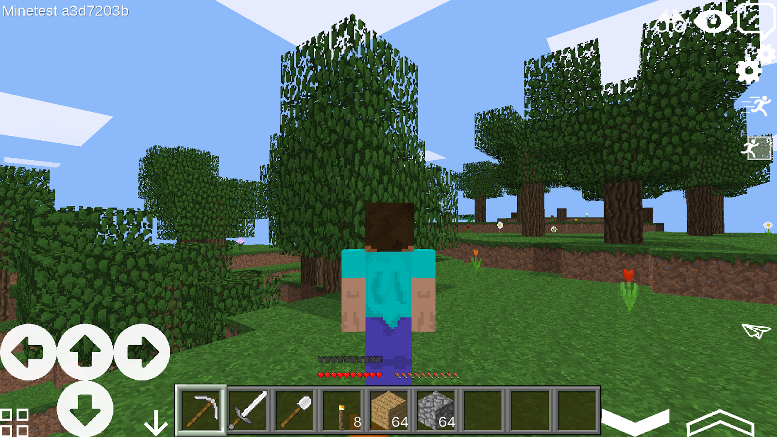 MultiCraft se controla a través de botones virtuales que aparecen en la pantalla de juego. A la izquierda hay flechas de dirección y a la derecha un botón para saltar. El salto es automático cuando te acercas a desniveles de un bloque. Y si pulsas el icono del avión de papel, MultiCraft II te deja volar.
