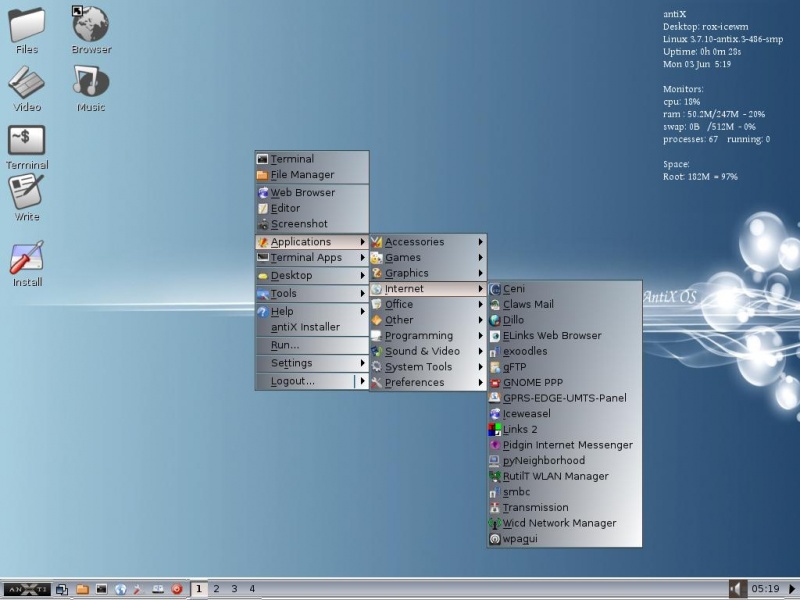- antiX también se puede instalar como un livecd en una unidad usb. Usar un live-usb-cd es muy rápido.