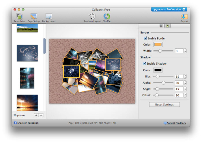 Para conseguir el collage deseado, CollageIt Free te pide que añadas las imágenes, 20 como máximo en esta versión gratuita de CollageIt, añadir o no un borde a las imágenes con el color y grosor deseado, incluir sombra en cada fotografía y, para redondearlo, seleccionar un fondo para el collage.
